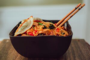 • Pad Thai z kurczakiem: Kurczak cieszy się dużą popularnością ze względu na swoją łatwą dostępność i neutralność smakową. Świetnie współgra z pozostałymi składnikami. Filet kroimy w kawałki, a następnie smażymy razem z makaronem ryżowym oraz sosem,
